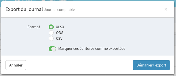 Lorsque le module d'export du journal comptable est activé, le modal d'export permet de choisir le format de son export parmi ceux qui sont activés dans la configuration du module.