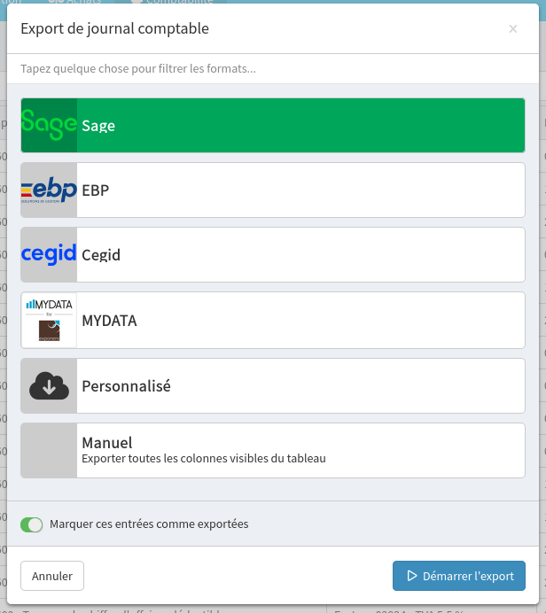 Le format d'export souhaité peut être sélectionné afin d'obtenir directement un export du format adéquat pour être importé dans le logiciel de comptabilité utilisé.